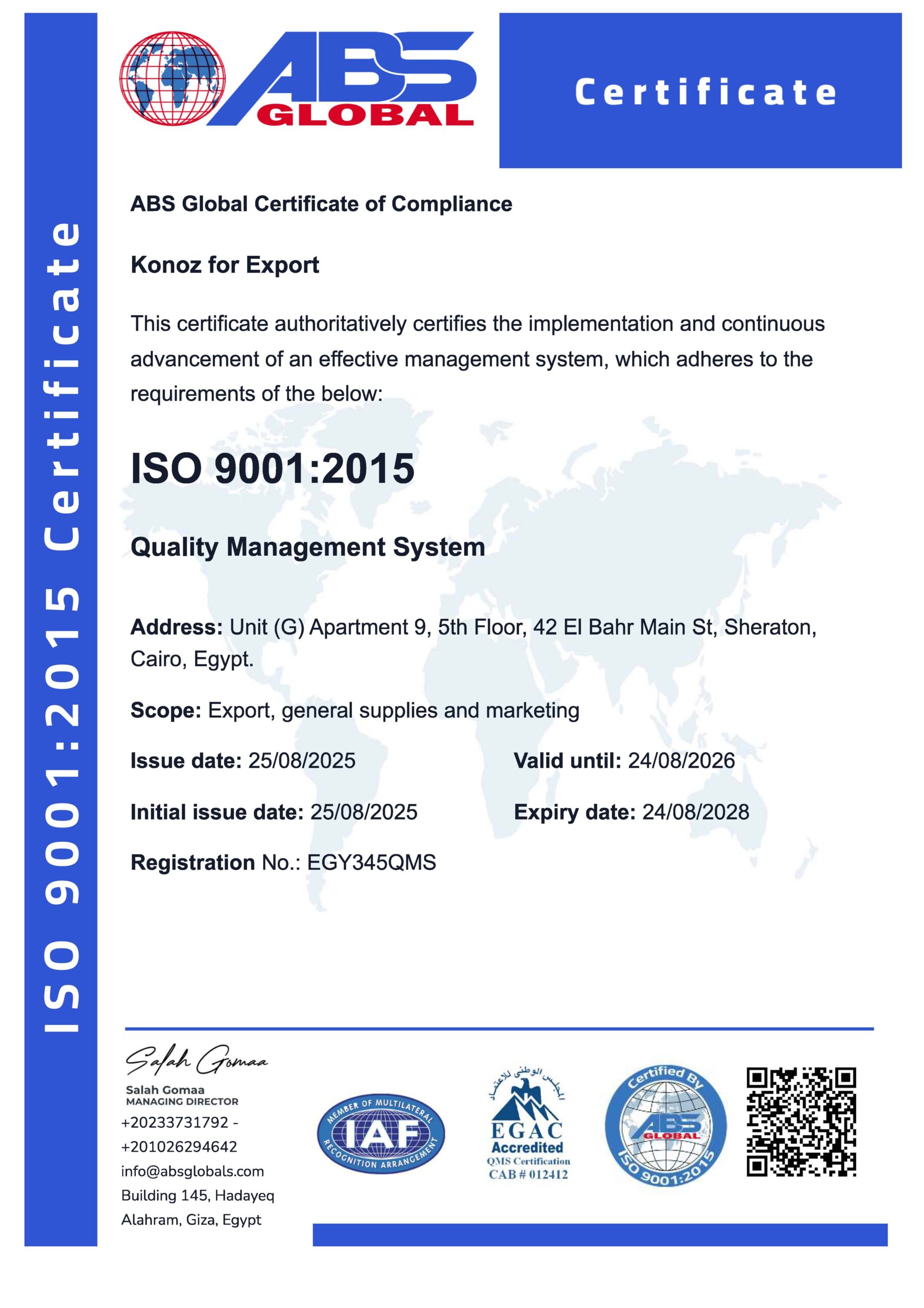 Konoz for Export is proud to announce that it has been awarded the ISO 9001:2015 certification for its Quality Management System. This achievement reflects our strong commitment to delivering high-quality export, general supplies, and marketing services while ensuring continuous improvement and customer satisfaction. The certification reinforces our dedication to excellence and international standards, positioning Konoz for Export as a trusted and reliable partner in global trade.